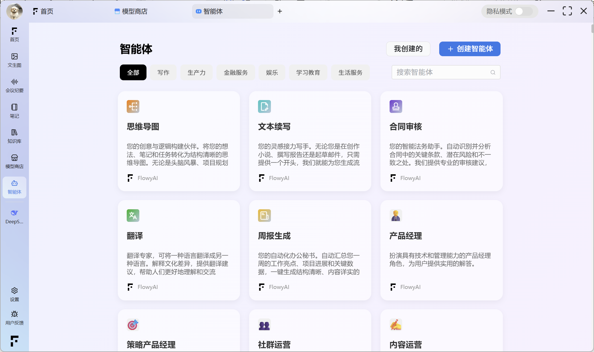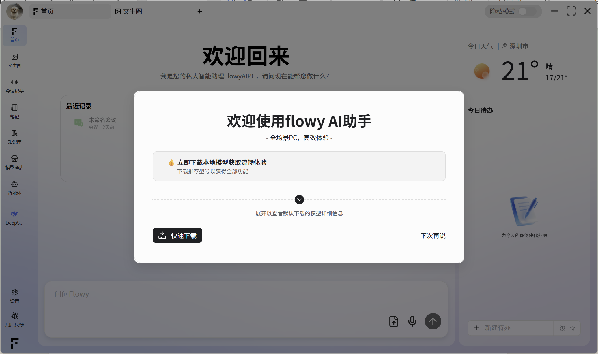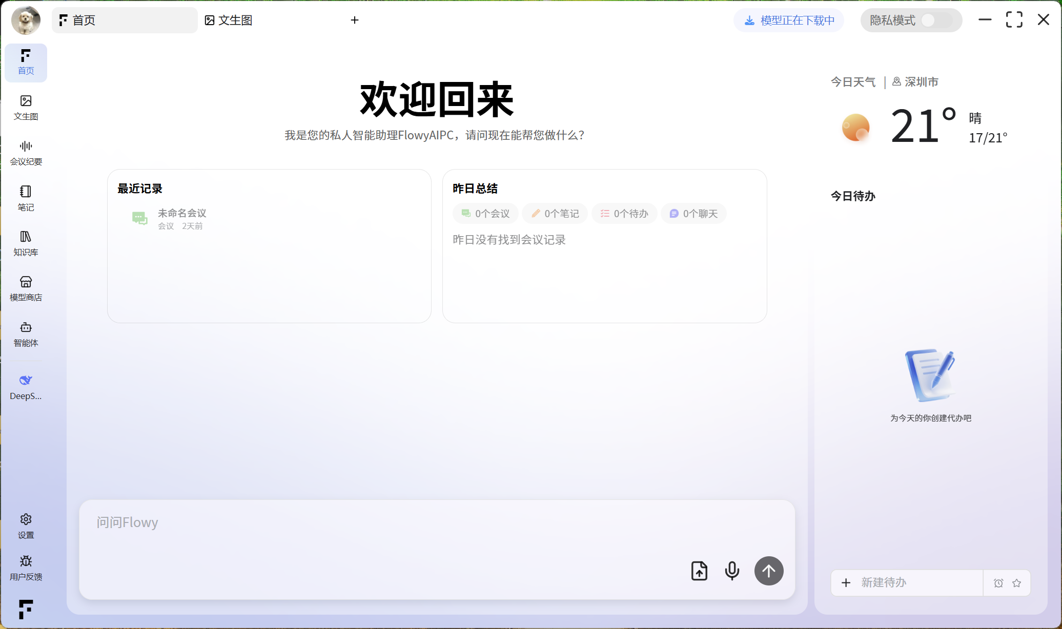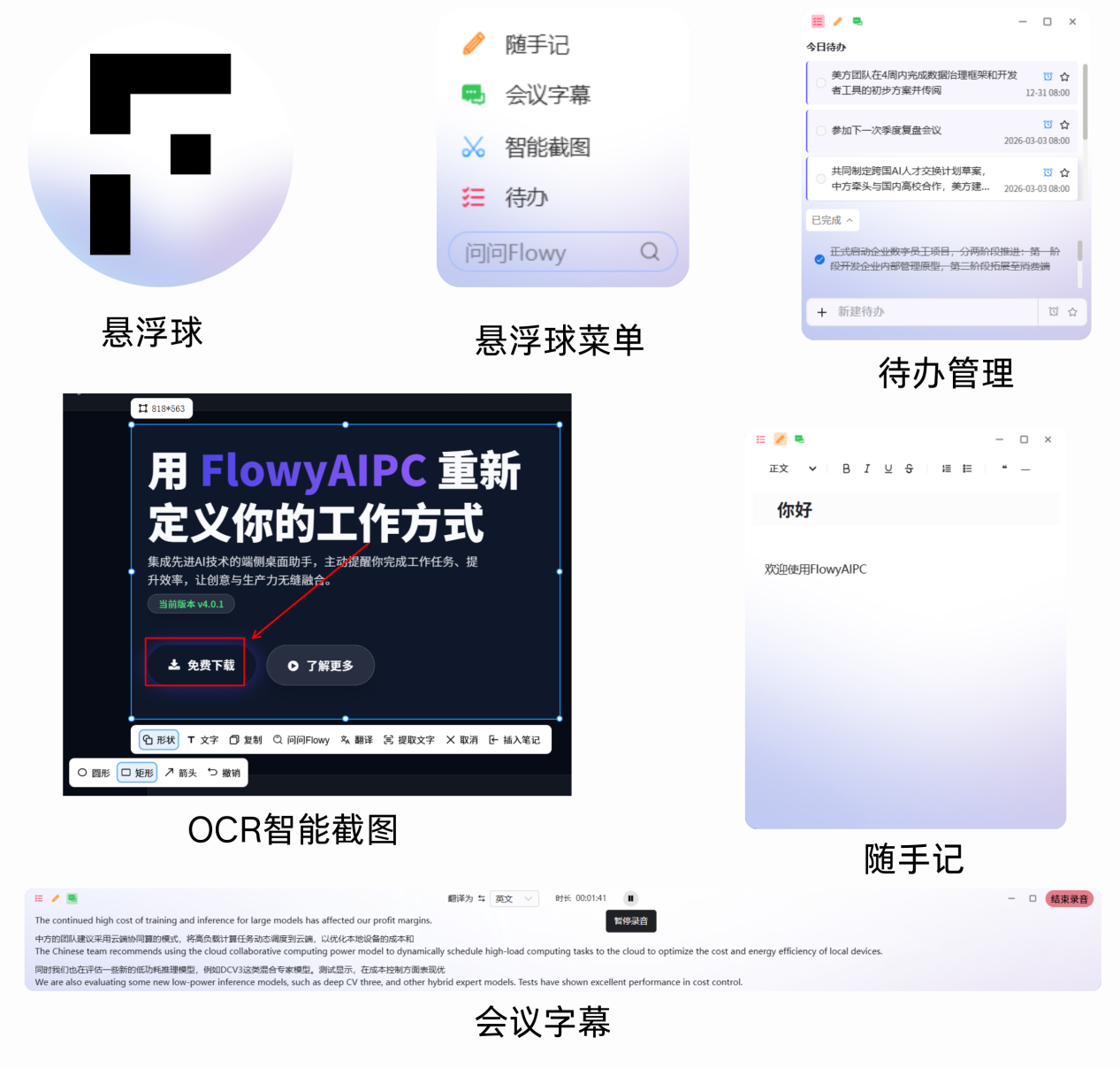 FlowyAIPC 是一款在电脑本地即可运行的大模型智能工具,用更安全的本地推理方式,让 AI 真正融入你的日常工作。从会议纪要、文生图、笔记整理、智能截图、知识库管理,到 760+ 智能体带来的写作、学习、运营、生产力等全场景能力,所有内容都在你的设备中完成、可控且稳定,不依赖云端、不泄露数据,让每个人都能拥有一套随时可用、私有、安全的智能工作系统。