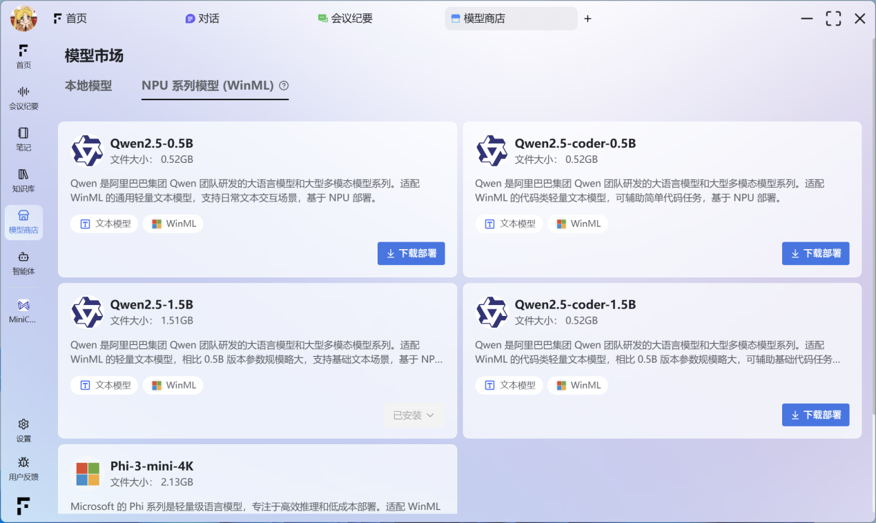 WML 模型:使用此类模型要求设备满足 Windows 11 版本 26100 及以上。此类模型支持在 NPU(神经网络处理器)上运行。