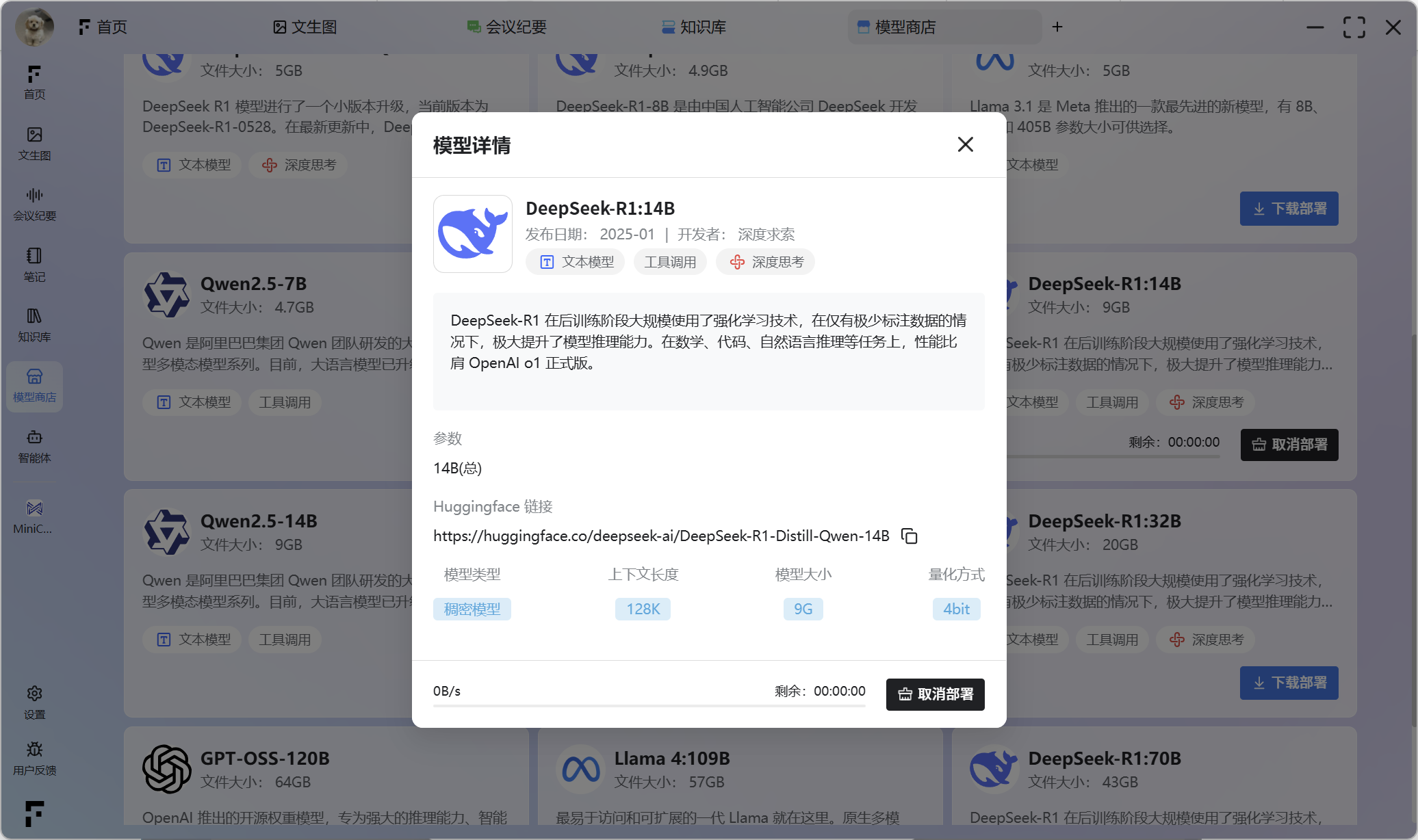 模型商店提供本地大模型选项。此类模型的特点是占用设备存储空间较大,需要较长的下载时间,并且要求用户在下载过程中维持稳定的网络连接,以确保下载的完整性与成功率。