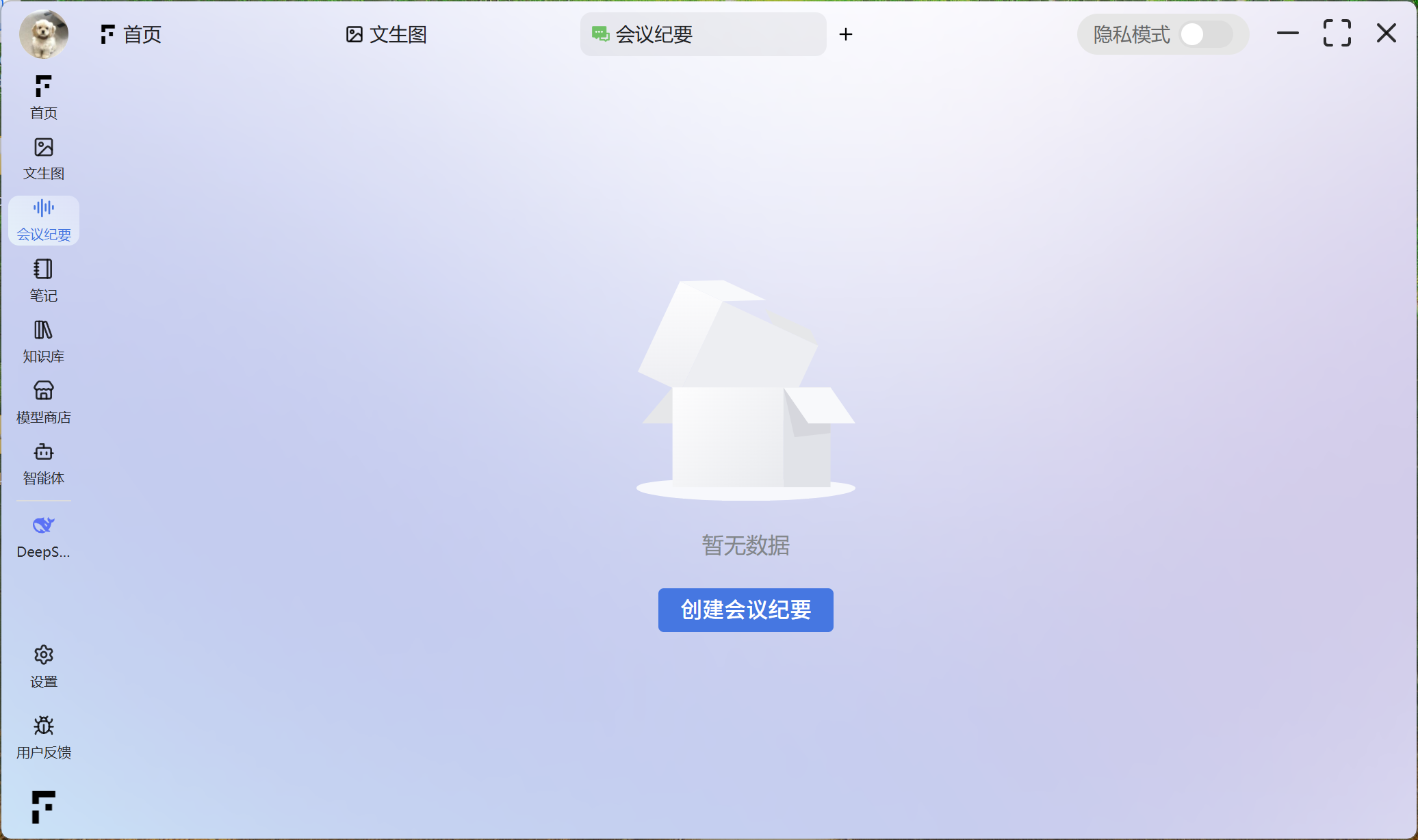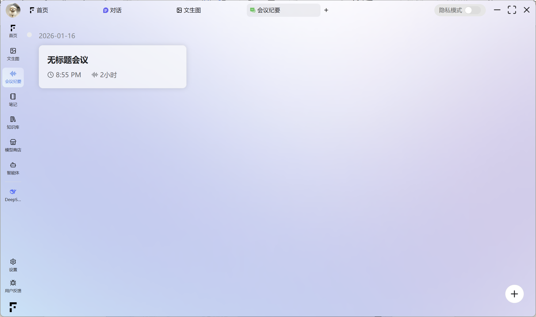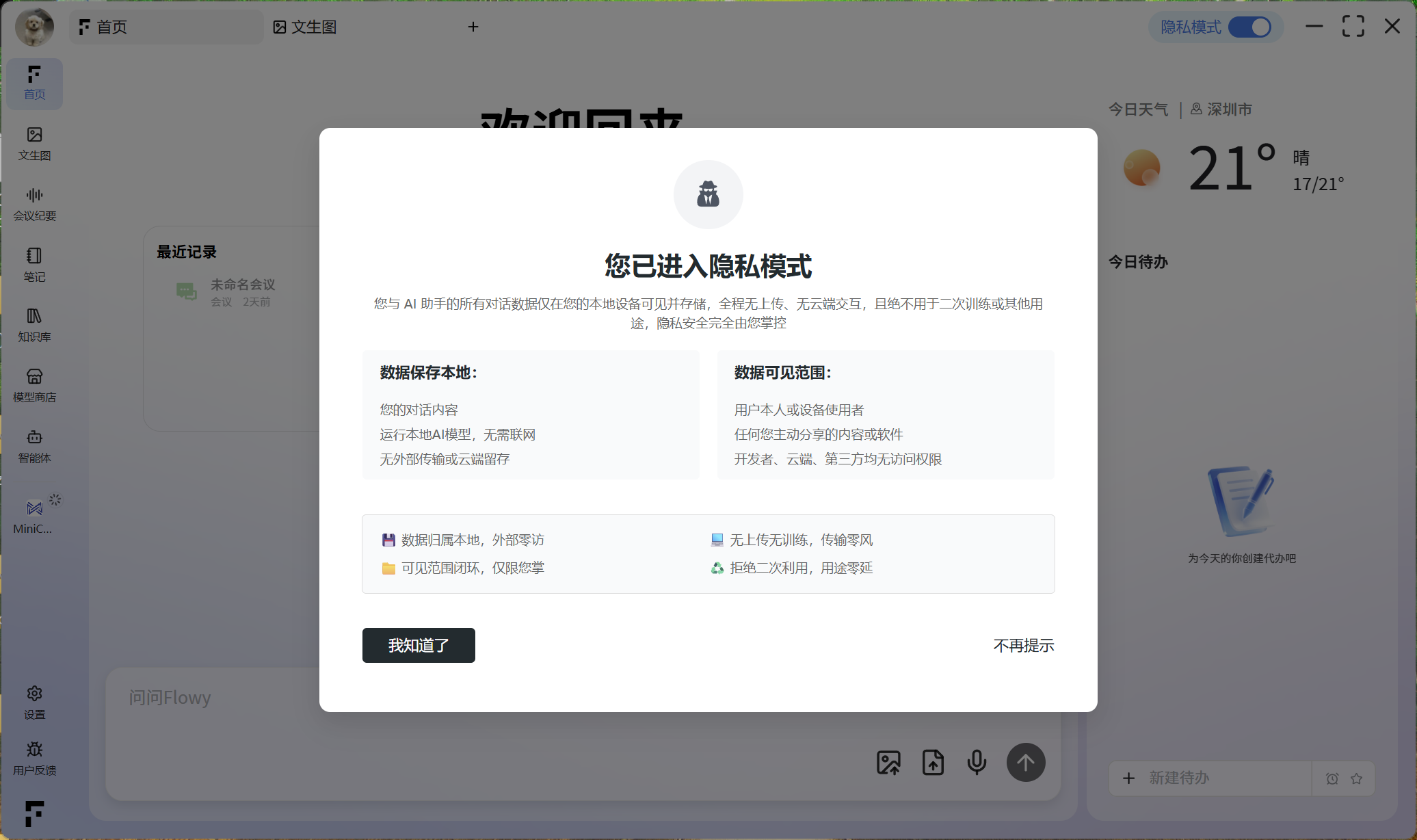 启用隐私模式后,本软件内的所有数据和资料将仅在本地设备进行存储和处理。这涵盖了您的会议纪要、笔记、智能体功能等所有相关内容,无需进行云端上传,从而确保了数据的高度私密性和安全性。
