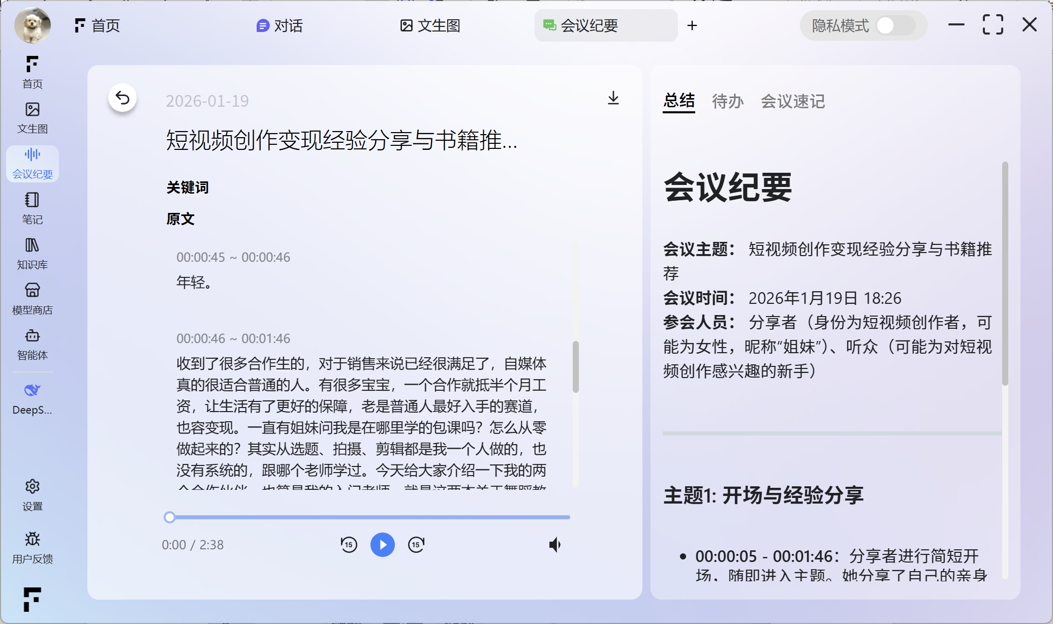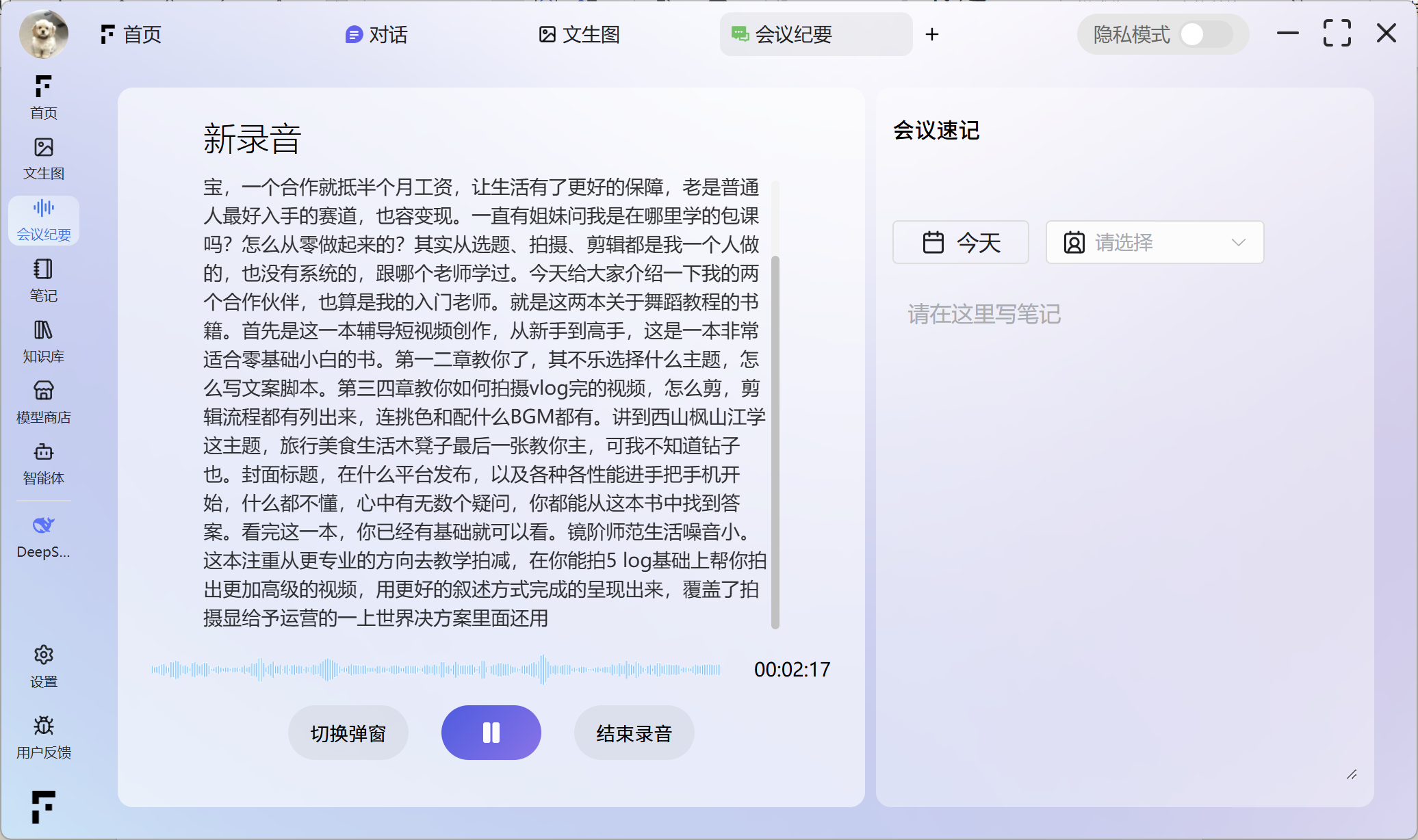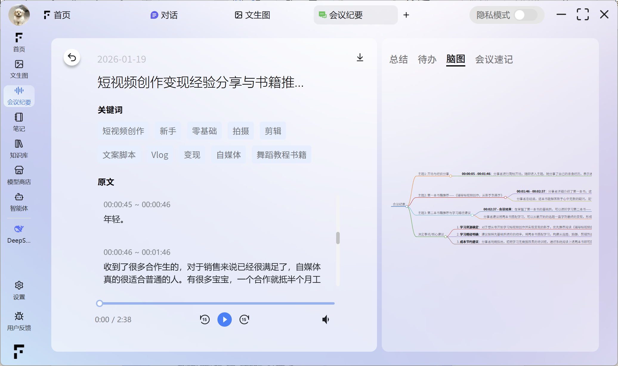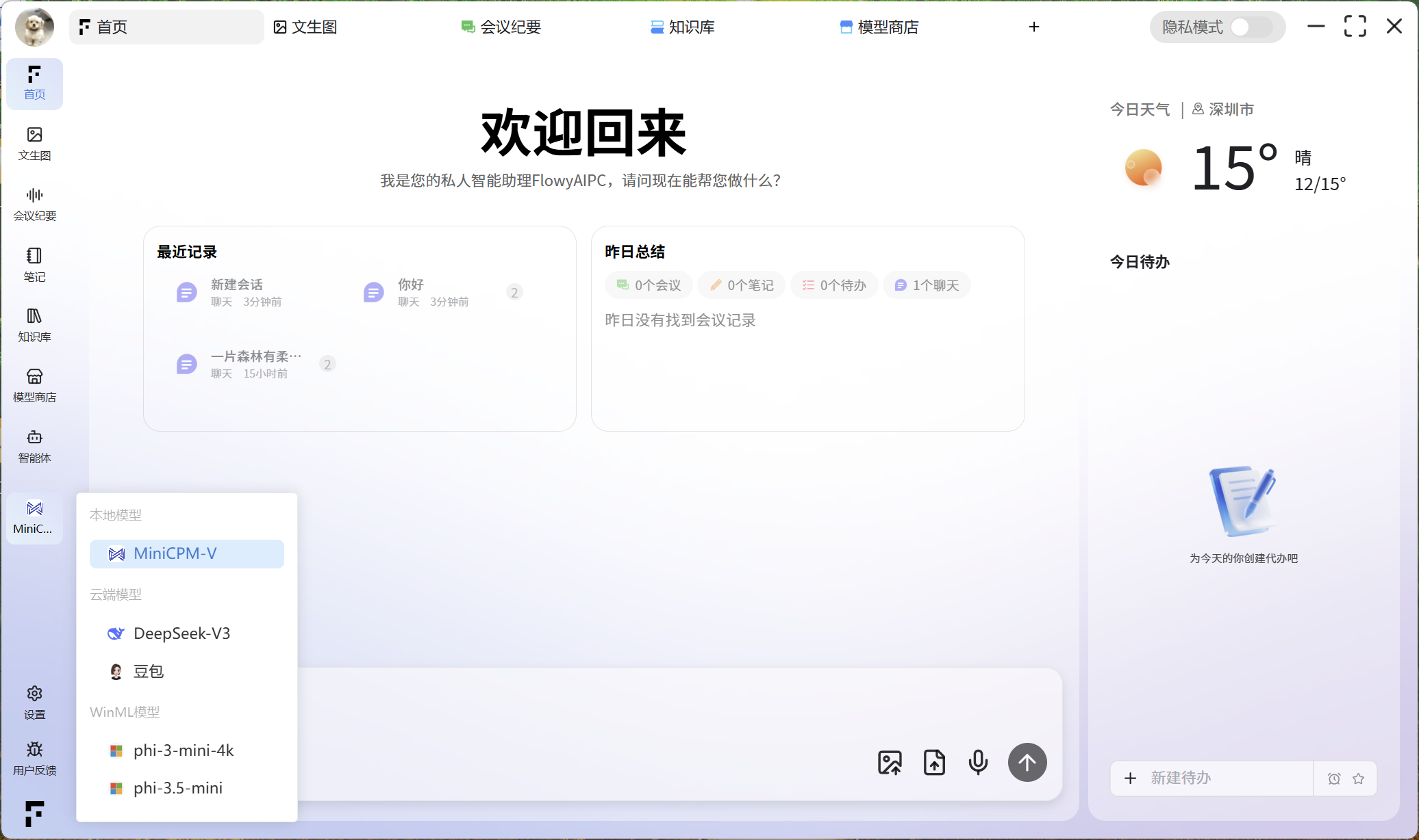 启用隐私模式后,本软件内的所有数据和资料将仅在本地设备进行存储和处理。这涵盖了您的会议纪要、笔记、智能体功能等所有相关内容,无需进行云端上传,从而确保了数据的高度私密性和安全性。